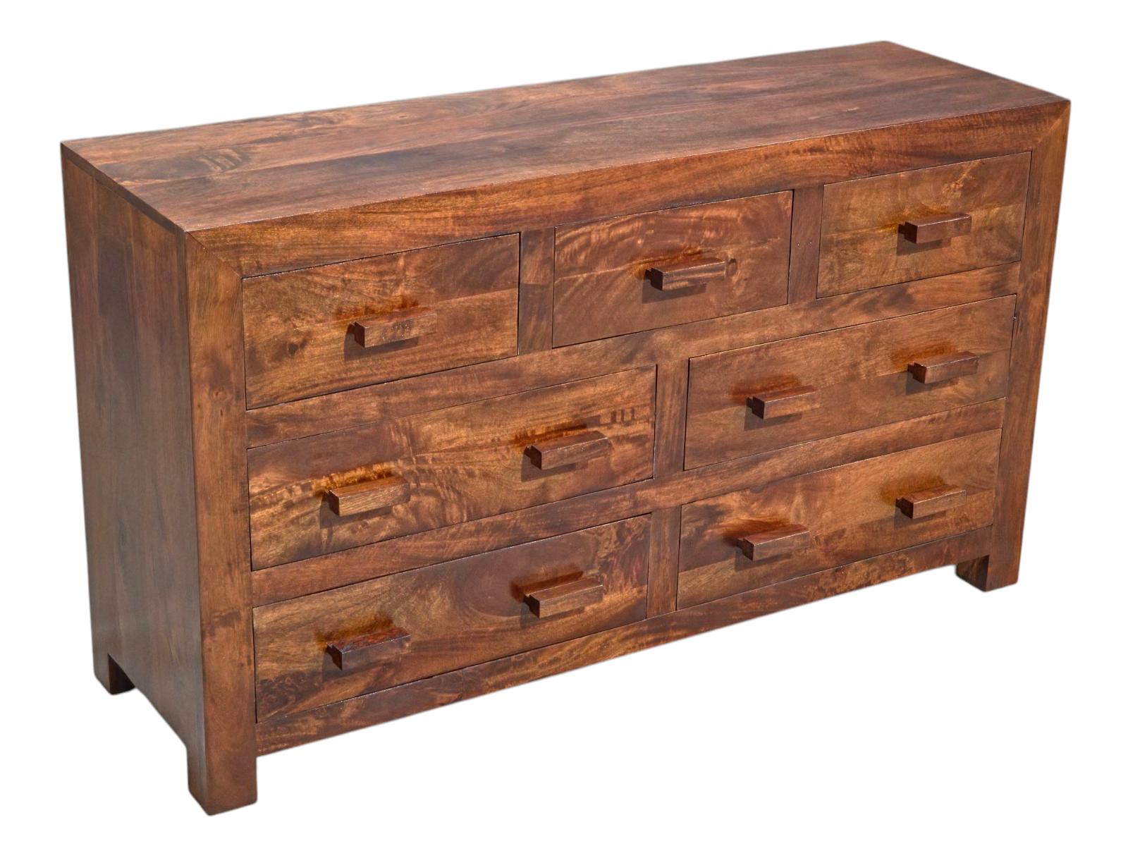 The deep, rich stain is beautifully protected by a smooth satin lacquer finish, which enhances the natural grain and brings a sophisticated sheen to your decor. Offering a comprehensive storage solution, its seven drawers are strategically sized to accommodate a diverse wardrobe