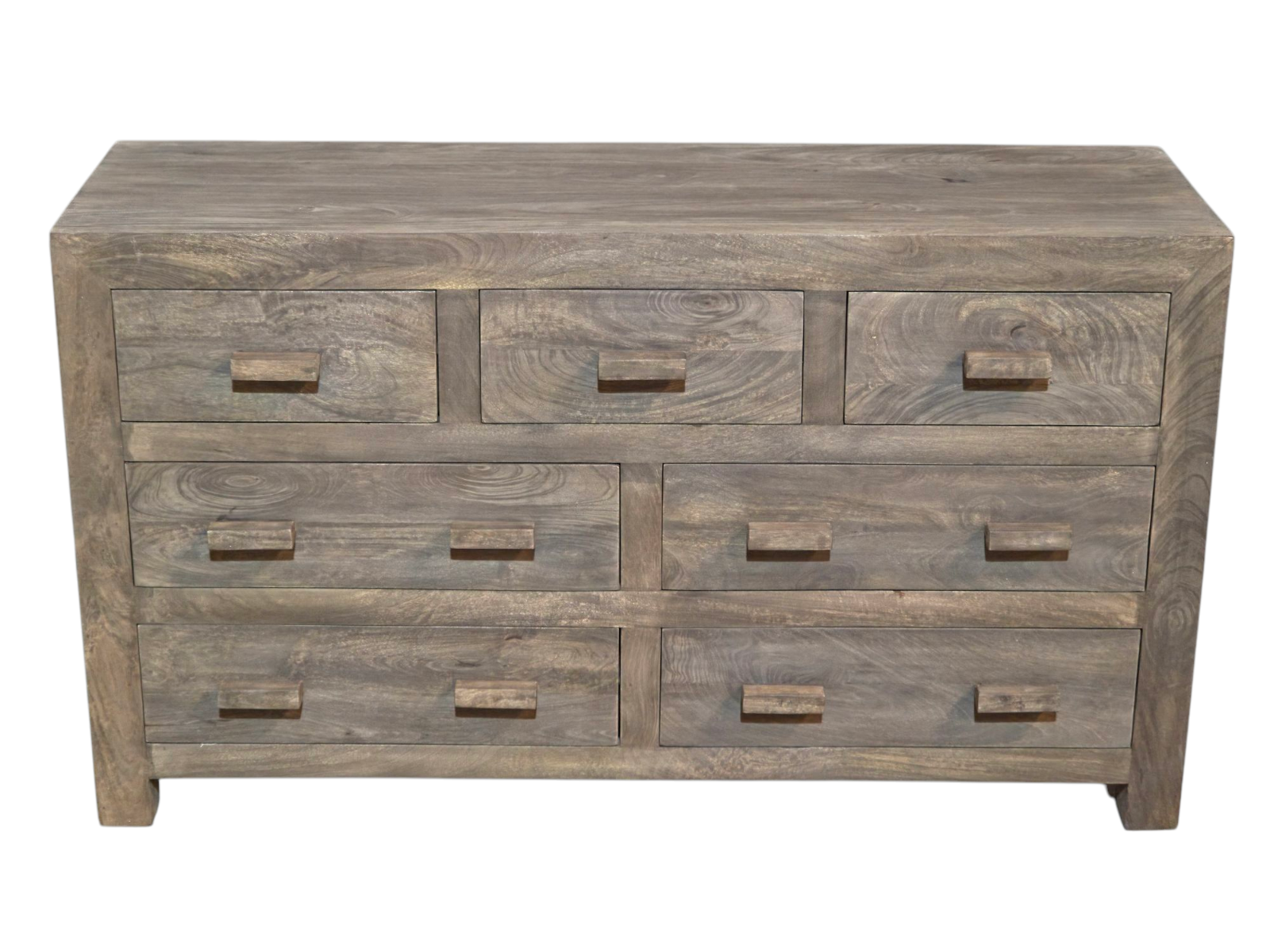 Featuring a natural stained matte finish, its unique grain and warm tones will effortlessly complement any decor, from farmhouse to contemporary. Offering a comprehensive storage solution, its seven drawers are strategically sized to accommodate a diverse wardrobe.