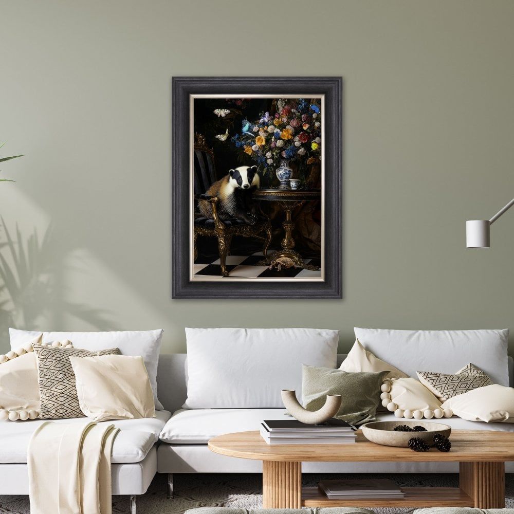 Bring a touch of endearing charm and whimsical curiosity to your walls with this delightful piece featuring a sweet badger comfortably nestled in an ornate chair, surrounded by a vibrant bouquet and fluttering butterflies.