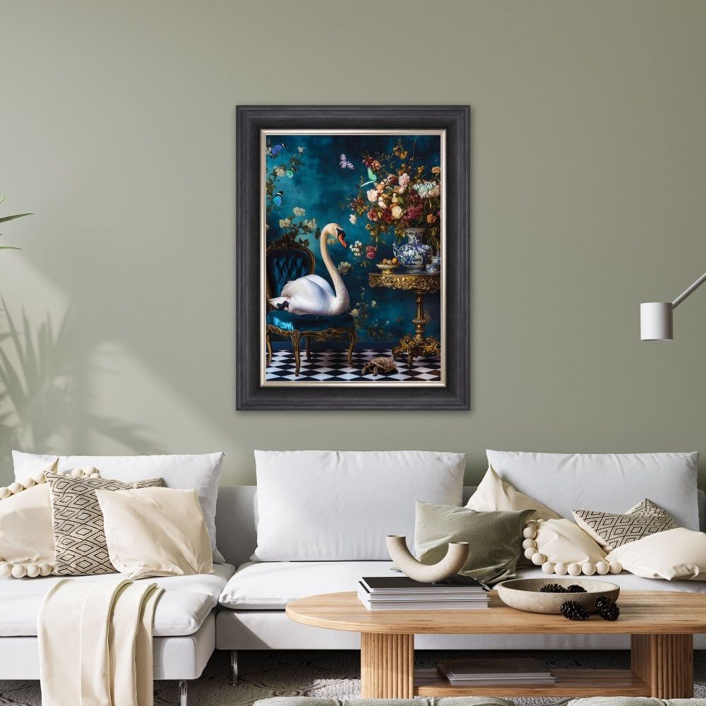Introduce an air of graceful tranquility to your home with this serene piece featuring a majestic swan regally perched on a plush teal chair, surrounded by a backdrop of delicate florals and fluttering butterflies.