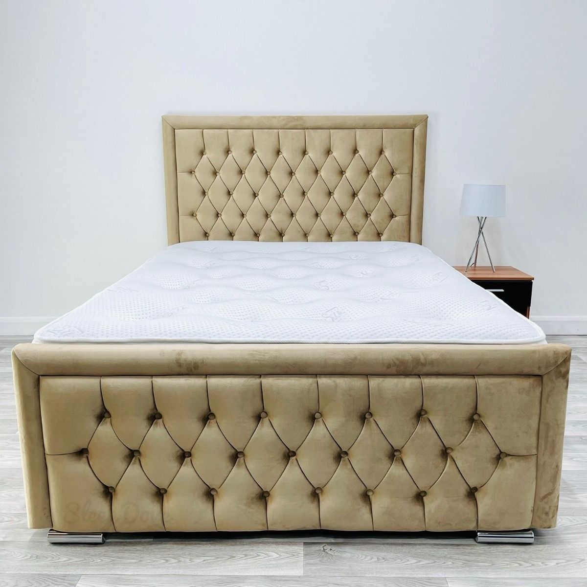 Introducing the new Luxury Elysia Bed, designed and handcrafted in Yorkshire to ensure unmatched quality. This beautiful bed features patterned upholstery, complemented by luxurious padded side rails and footboard, and is constructed with a solid timber frame for maximum stability.