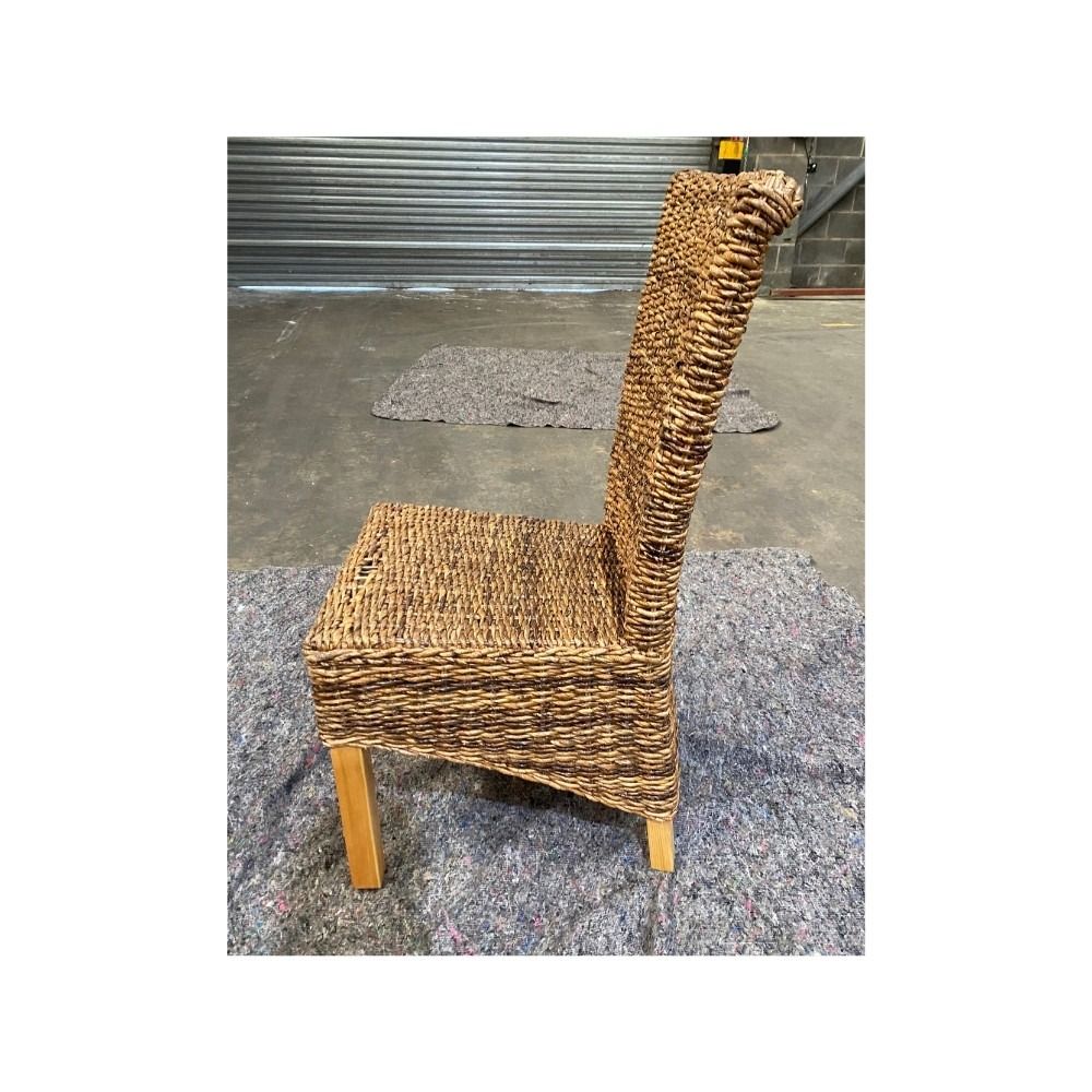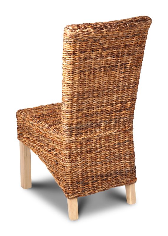The Light Rattan Rollback Dining Chair is made from a combination of Natural Banana Leaf Fibres woven around a durable Natural Wood Frame that features light wood legs.