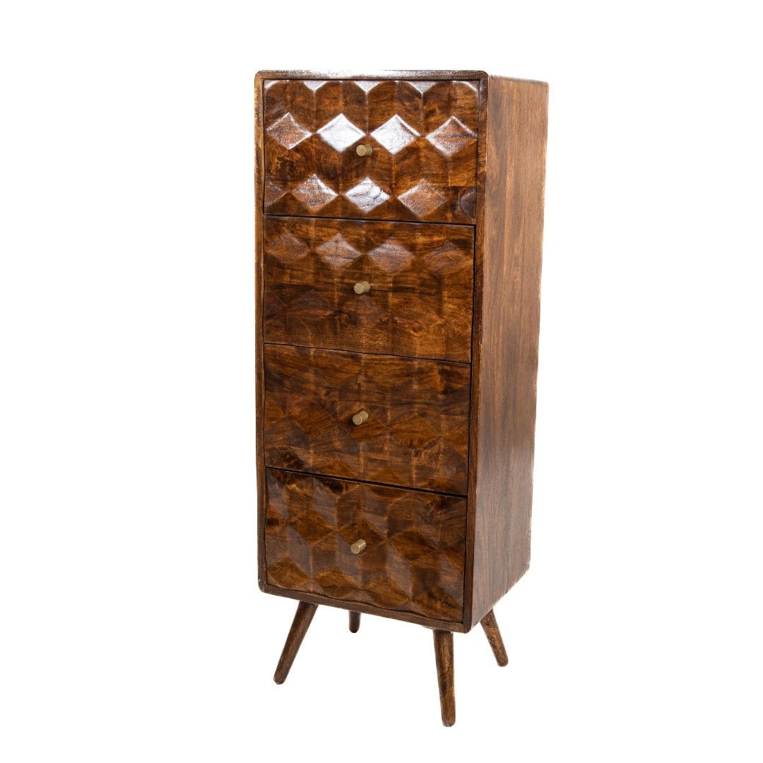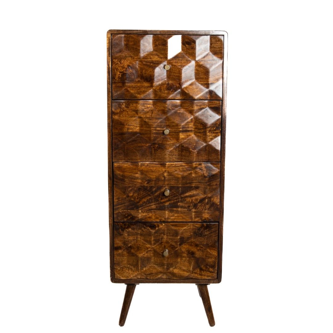 The Geo Mango Tall Chest will be the perfect home addition to any living room,dining room or home study, with 4 spacious drawers this unit will have an abundance of storage space for all of your home accessories whilst showcasing a sleek design.