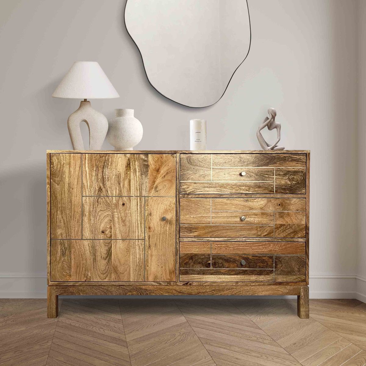 This stunning Inset Light Mango Wood Small Sideboard will be a perfect addition to any smaller home dining space. Featuring a single cupboard with a shelf and three drawers this unit offers a large amount of storage possibilities.