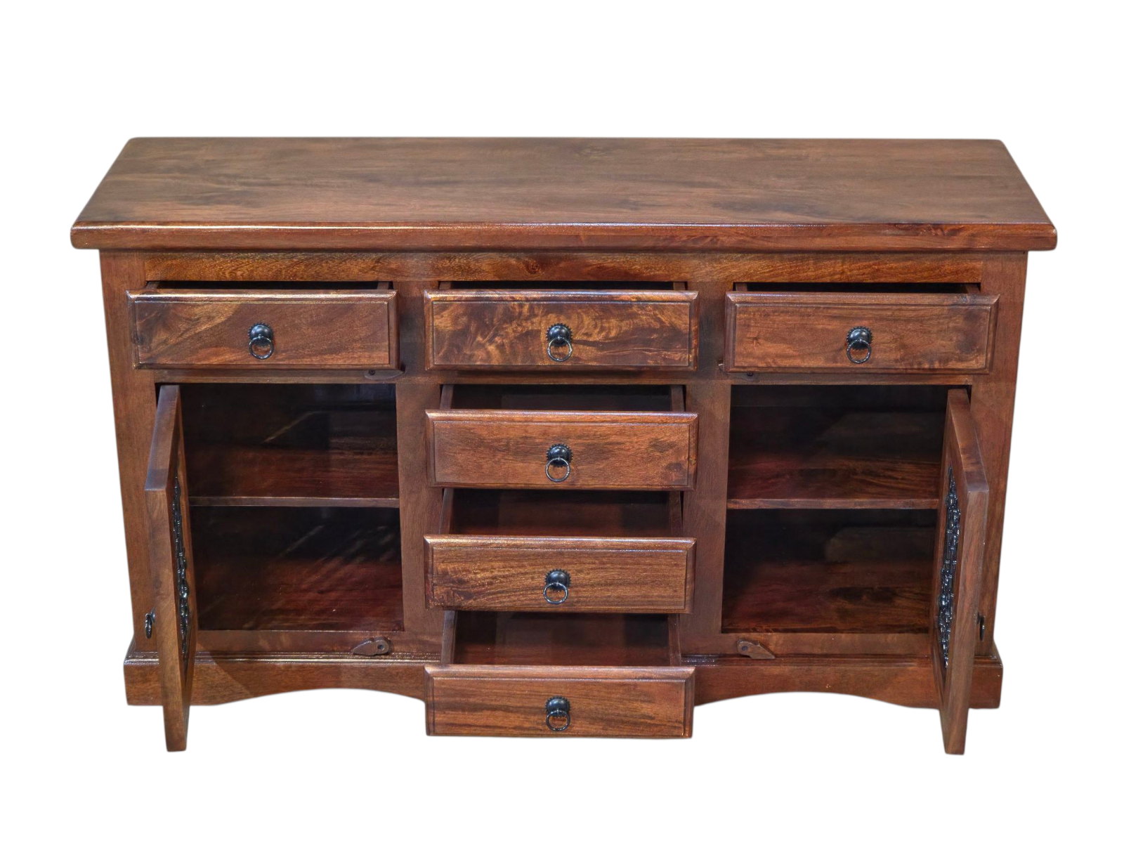 The Jali Mango - 2 Door Large Sideboard showcases a rich honey finish that subtly emphasizes the visible grain throughout the wood, complemented by the distinctive black ironwork. This piece is finished with a satin lacquer, which gives the furniture a beautiful soft sheen and ensures durability.