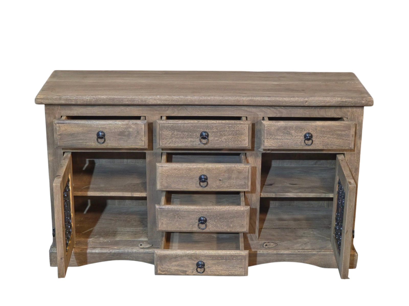 This Jali Mango 135CM 2 Door Sideboard's includes three top drawers, four central drawers, and two spacious end cabinets (with interior shelving). The rich grain and warm tones are protected by a matte lacquer finish, which brings a natural look to your decor.