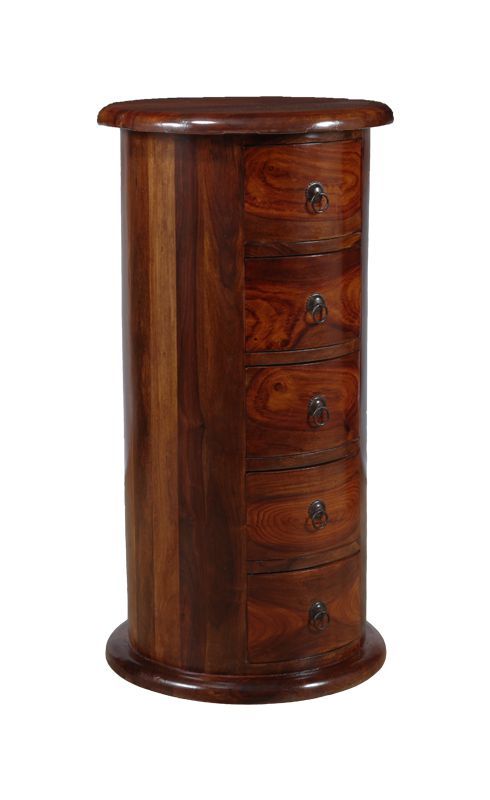 This unique Jali Mango 5 Drawer Drum is a stylish and functional accent piece for any room. This unique 3-drawer drum table is a stylish and functional accent piece for any room. The rich, warm tones and natural grain of the wood create a captivating look, while the compact, rounded design saves space and adds visual interest. Featuring three stacked drawers, each with an antique-style metal ring pull, it provides convenient storage for small essentials. Perfect as a bedside table, an end table, or a decorative accent.