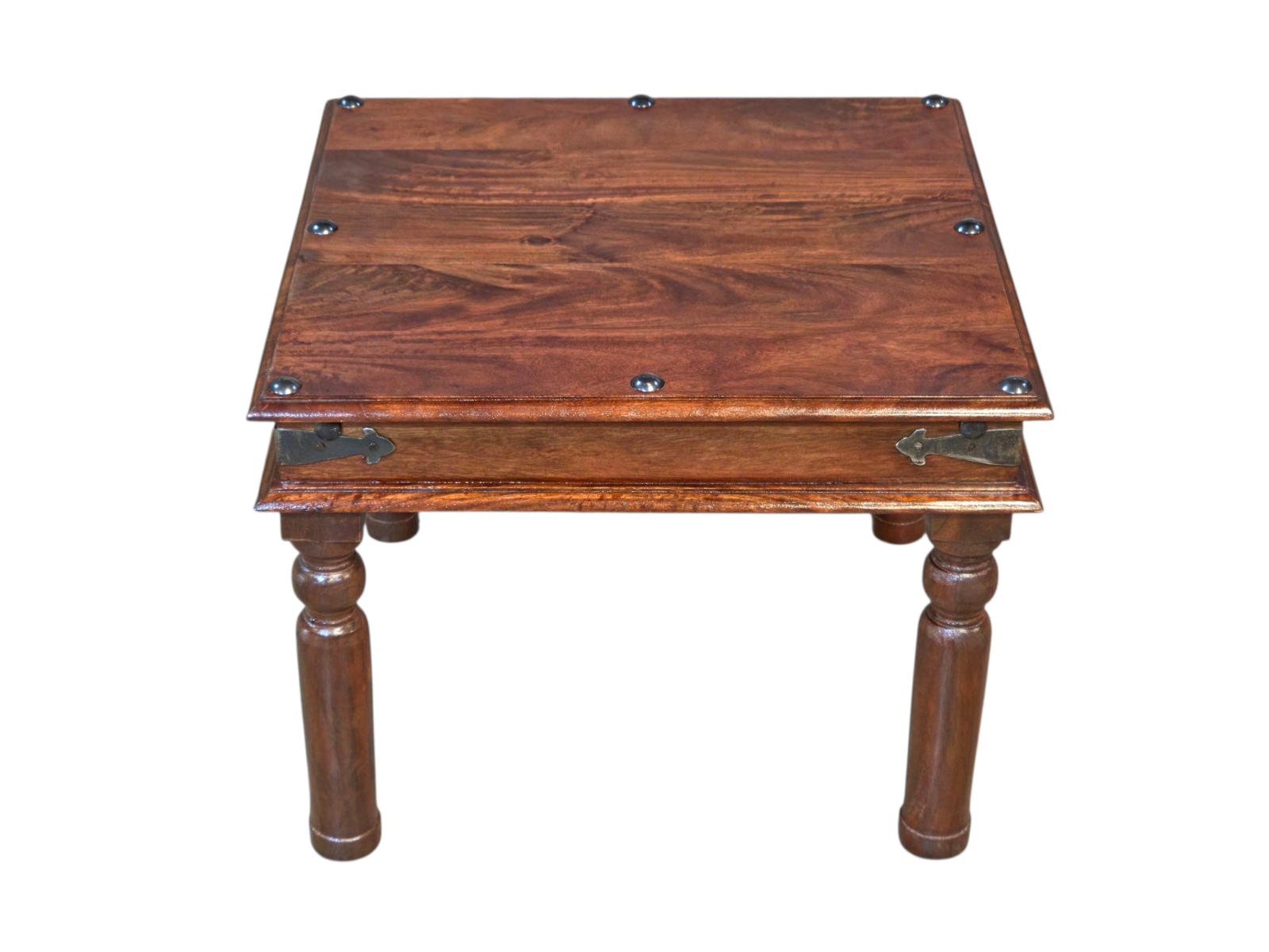 This Jali Mango Honey Thakat Table features a deep, rich stain is protected by a smooth satin lacquer finish, which enhances the natural grain and brings a soft sheen to your decor. Featuring robust iron metal details, including decorative studs and distinctive hinges.