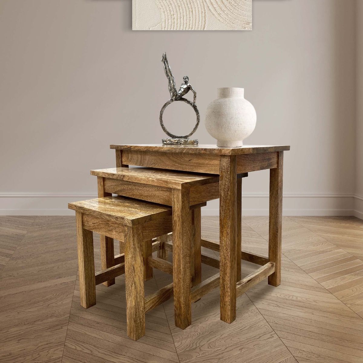 Our Light Dakota Small Nest is made from the highest quality 100% solid Indian Mango Wood and is is finsihed with a satin lacquer.