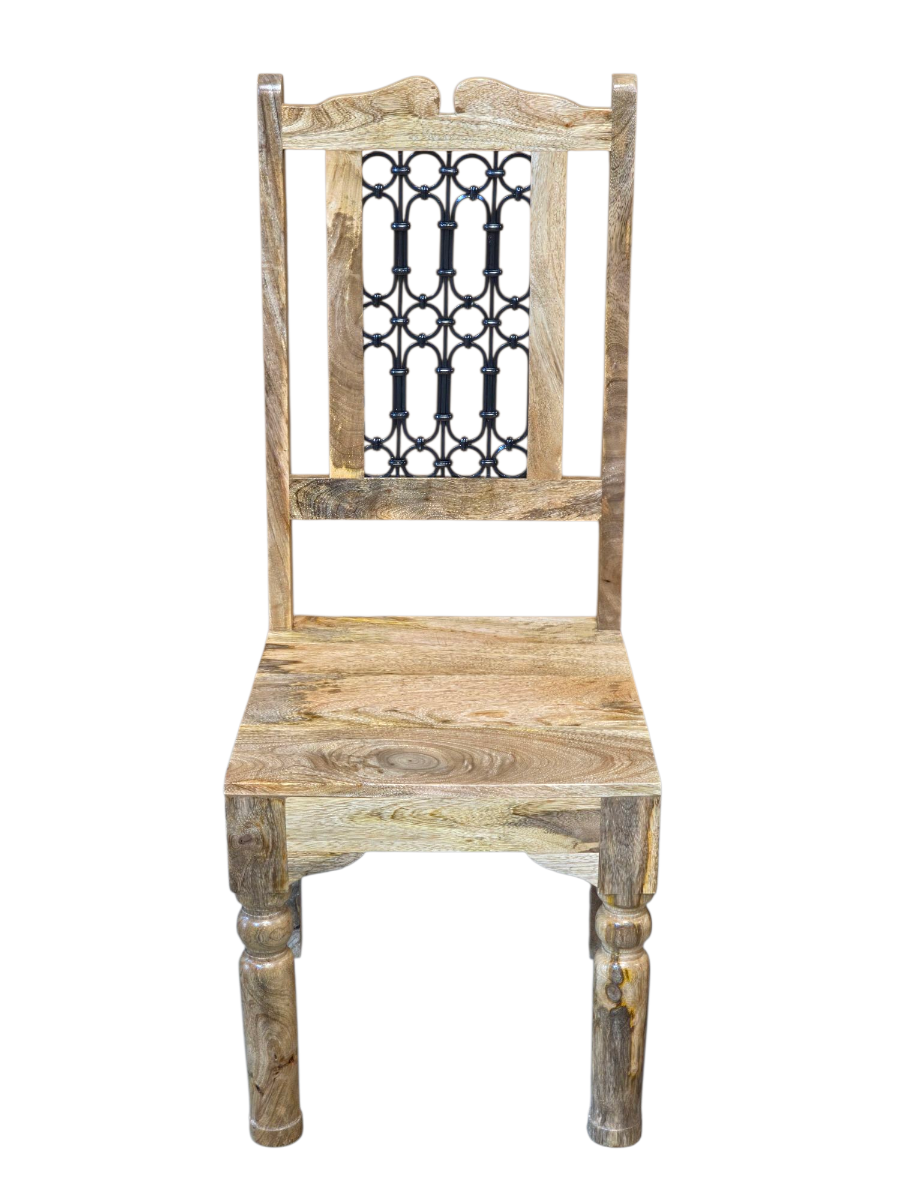 This Jali Mango Dining Chair features a high iron work panel backrest provides comfortable support, while the sturdy construction ensures lasting quality for everyday use.