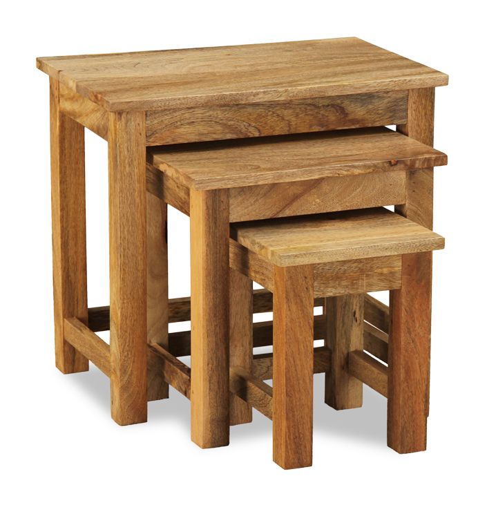 The Light Mango Wood Nest of Tables is made from 100% indian solid mango wood throughout, including the backs and bases of each piece. Mango wood is naturally multi-tonal making each piece unique in appearance and is finished with a satin lacquer which gives the furniture a beautiful soft sheen and ensures durability.