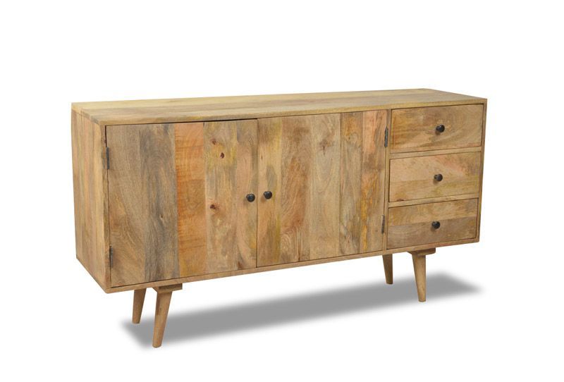 The Light Retro Chic Large Sideboard is the ideal storage solution for your home, featuring two cupboards with a built-in shelf and three drawers for storage.