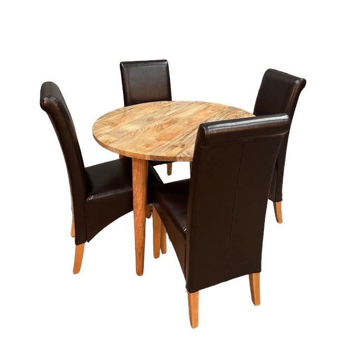 Light Vintage Mango 100cm Round Dining Table & 4 Leather Rollback Dining Chairs - Due 5th May