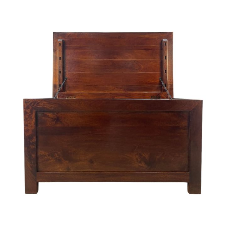 Each blanket box is crafted from 100% solid mango wood and in this particular piece is given a dark wood finish with satin lacquer to enhance durability.