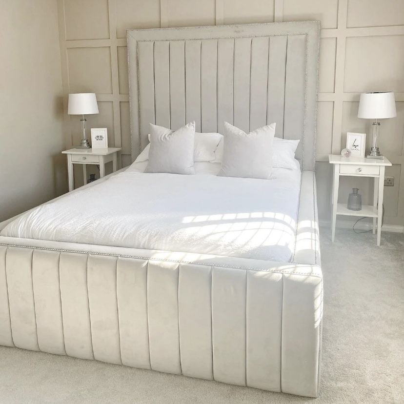 Introducing the new Luxury Luna Bed, designed and handcrafted in Yorkshire to ensure unmatched quality. This beautiful bed features a plush, padded headboard with deeply cut vertical lines and a deep border, complemented by a matching footboard. Built with a solid timber frame, it ensures maximum stability and durability.