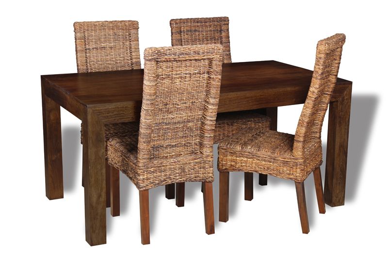 Each chair is woven from natural banana leaf fibres and the table is crafted from 100% solid Mango Wood and is finished with a satin lacquer to enhance durability.