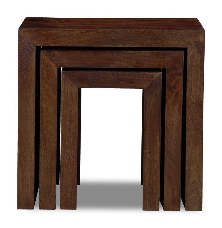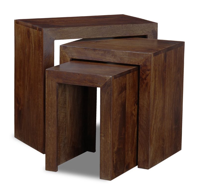 The Mango Wood Chunky Nest is is made from 100% indian solid mango wood throughout, including the backs and bases of each piece. Mango wood is naturally multi-tonal making each piece unique in appearance. This range is stained to achieve the dark appearance and finished with a satin lacquer which gives the furniture a beautiful soft sheen and ensures durability.