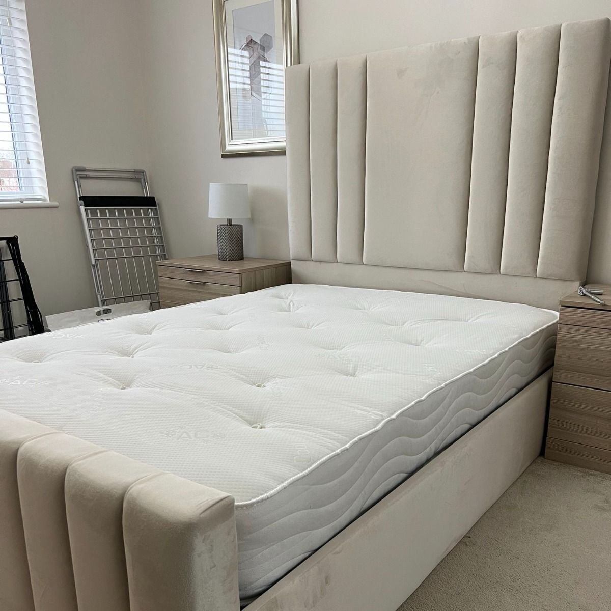 Introducing the new Luxury Stella Bed, designed and handcrafted in Yorkshire to ensure unmatched quality. This beautiful bed features deeply cut vertical lines in the upholstery, complemented by luxurious padded side rails and footboard, and is constructed with a solid timber frame for maximum stability.