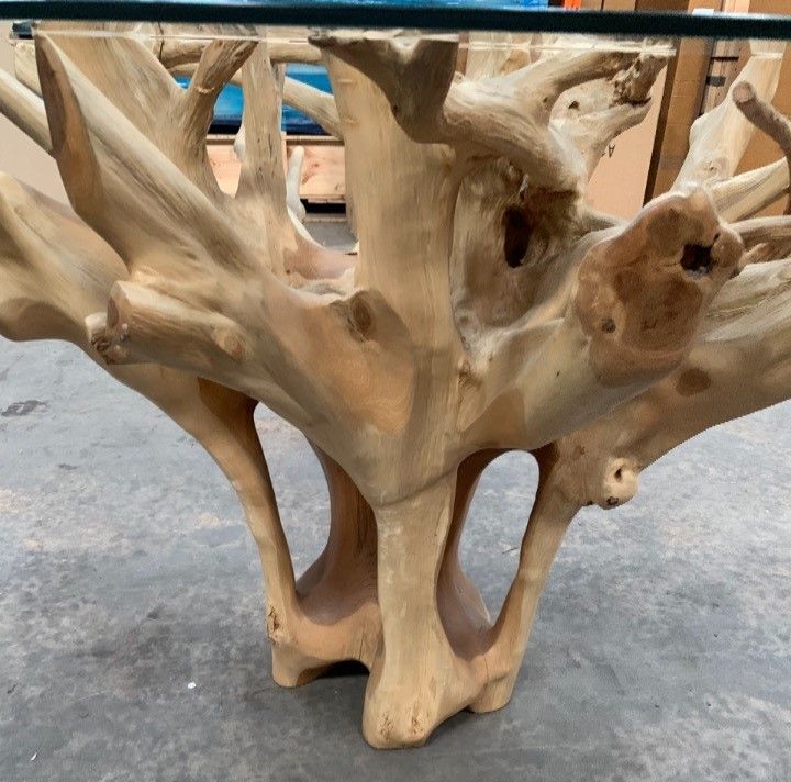 This unique Teak Root Dining Table is created from the root of a Tree. With the base being a root from a tree and a circular roomy glass top it’s great for the family home. Each Teak Root Dining Table seats up to 4 people with a large table top, making it great for meals and game nights.