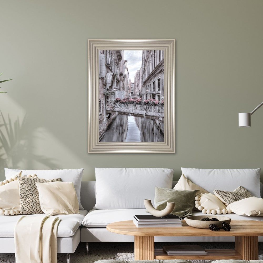 Transport yourself to the enchanting waterways of Venice with this beautifully framed print. Capturing a picturesque canal scene, complete with charming architecture, a delicate bridge adorned with vibrant flowers.