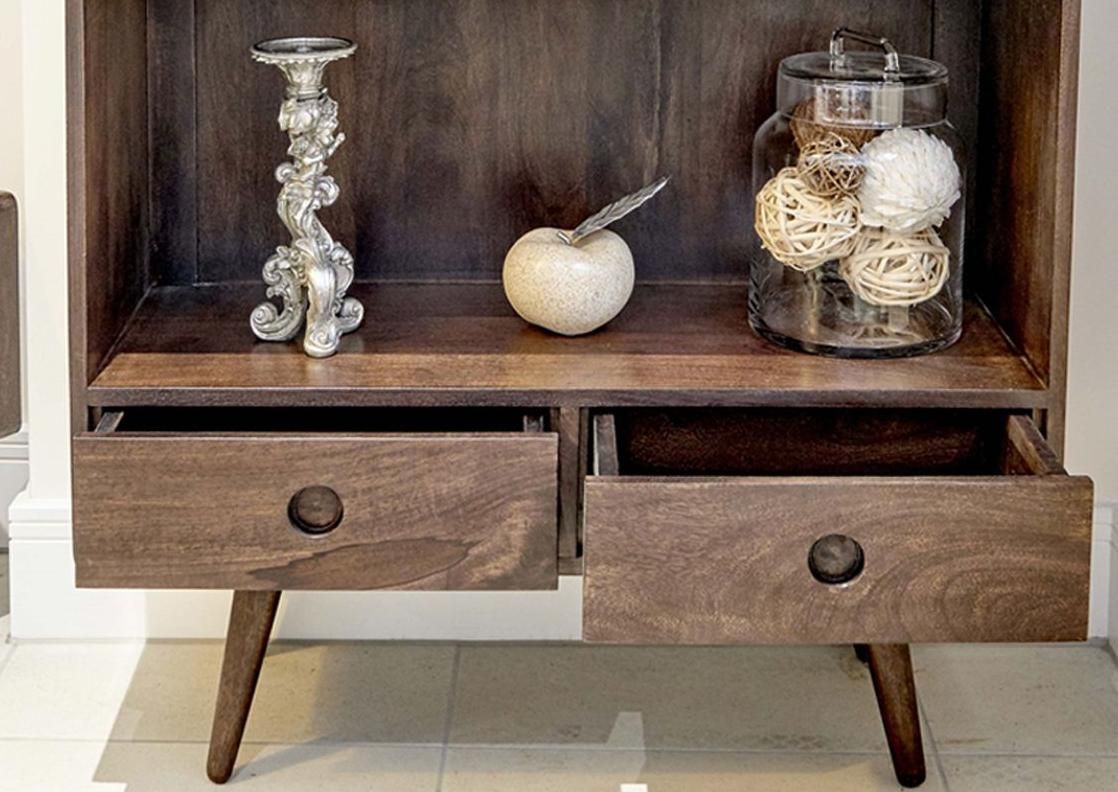 Our Vintage Mango Bookcase comes with 4 shelves and two drawers side by side at the base of the unit each can be used for storage of books, folders and can also showcase decorations.